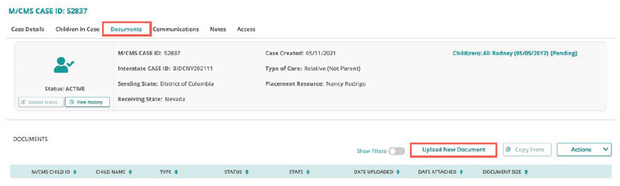 - The caseworker will then navigate to the Documents page and select “Upload Document.”